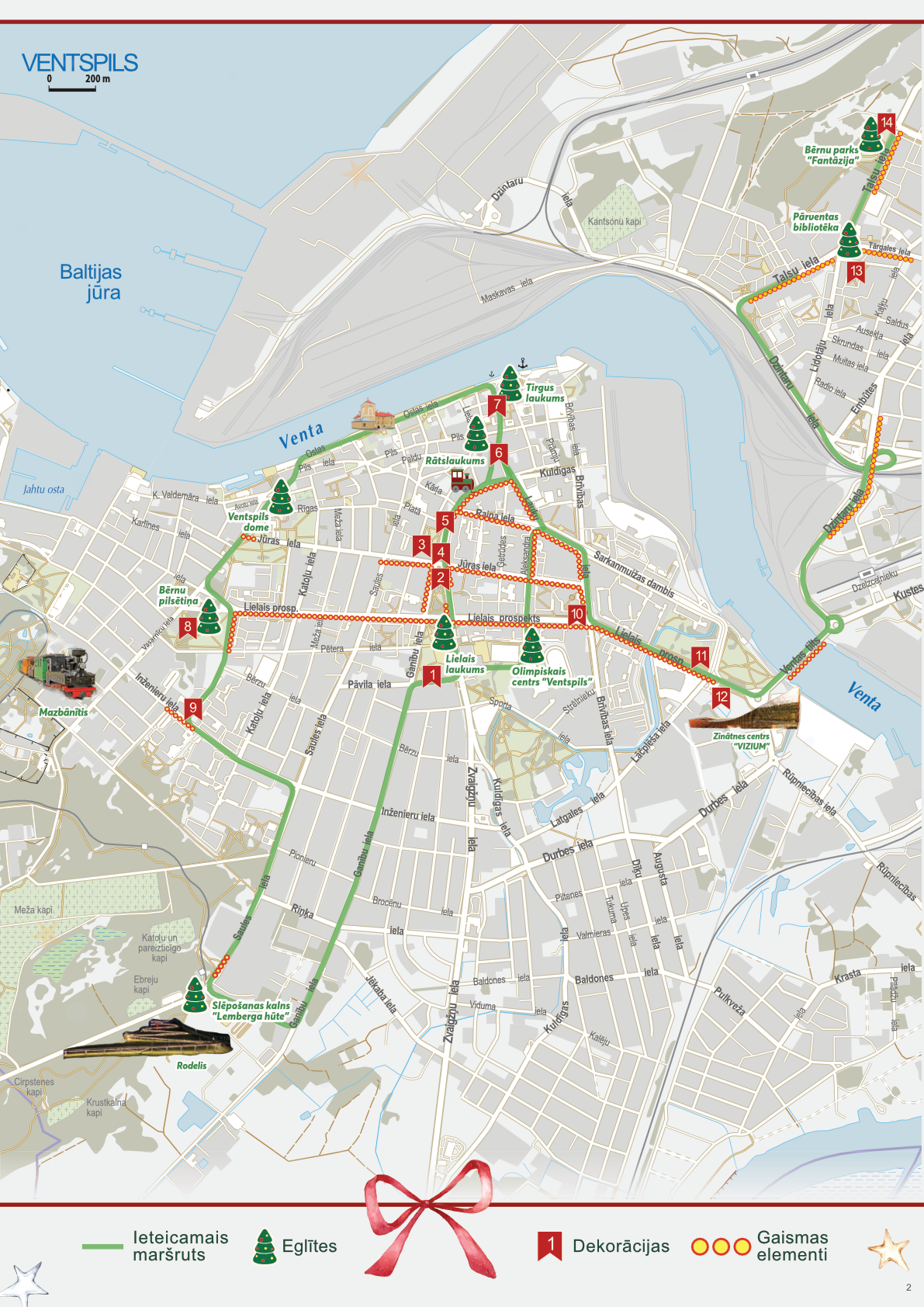 Pilsētas galvenā egle mirdz svētku brīnumā, bet pie Lielā prospekta slejas 2026. gada skaitlis ar Ventspils ģerboņa medību raga akcentu. Svētku noskaņu papildina arī mirdzoša mūzikas instrumentu kompozīcija.